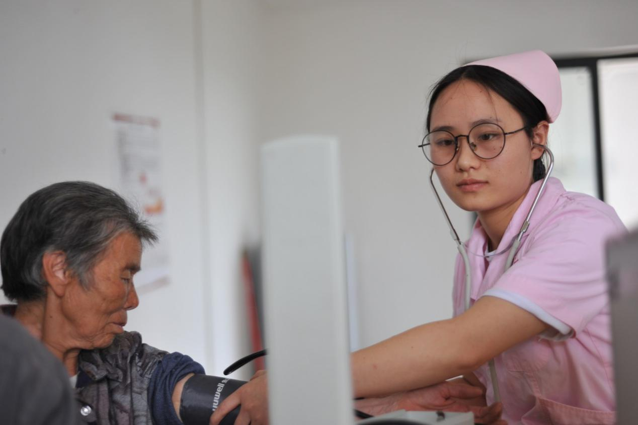 A family doctor provides medical service to a resident in a resettlement community in Fuquan, Guizhou Province. / VCG Photo