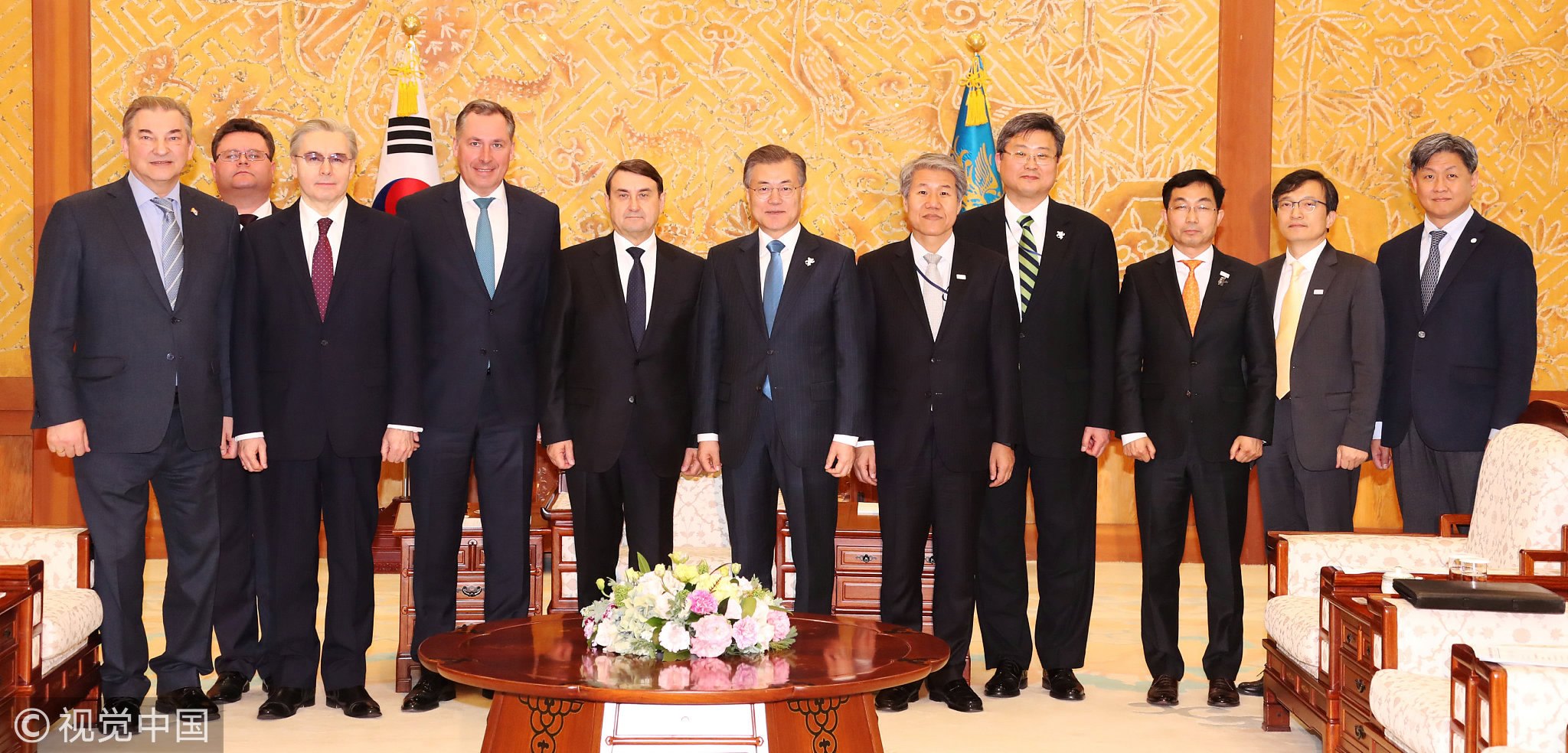 South Korean President Moon Jae-in poses for photographs with delegation of the Olympic Athletes from Russia during their meeting at the Presidential Blue House in Seoul, South Korea, February 20, 2018. /VCG Photo