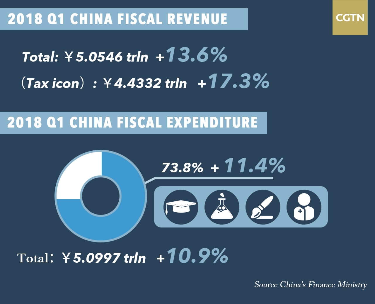According to China's Finance Ministry, government fiscal revenue and expenditure for the first quarter fixed slightly over five trillion yuan each, which means double-digit year-on-year growth for both.