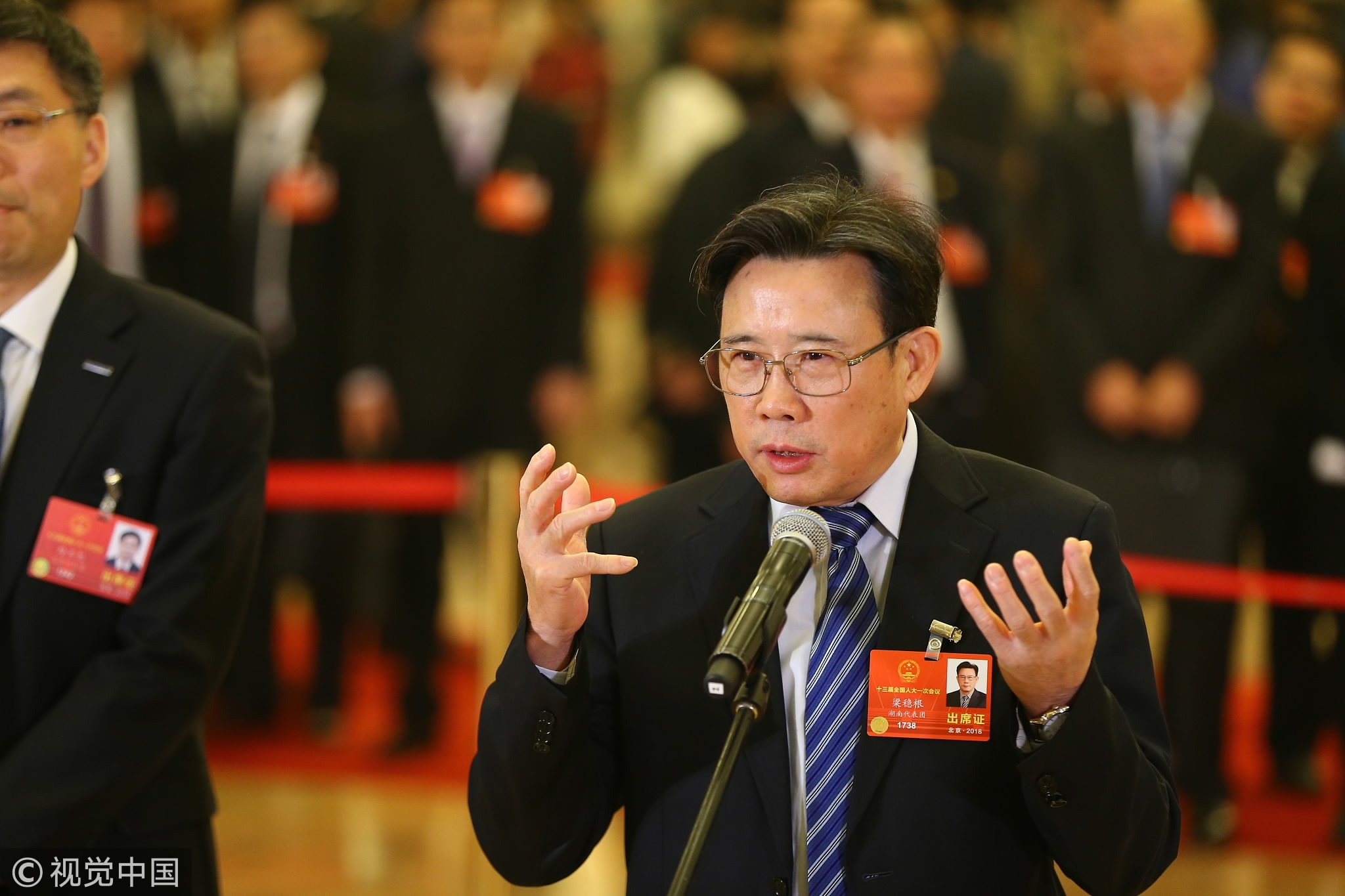 March 13, 2018: NPC deputy Liang Wengen, also founder of SANY Group, speaks to the press at the fourth "NPC Deputies' Corridor" of the Two Sessions at the Great Hall of the People in Beijing, China. /VCG Photo