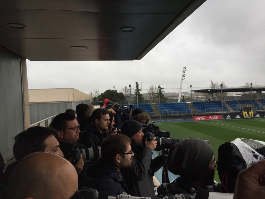At Real Madrid’s training grounds on the city outskirts in the morning, Los Blancos came out to kick the ball around and get soaked, while the TV camera operators and photographers from Spain, Italy, and many other countries took care to keep their gear dry in the deluge.