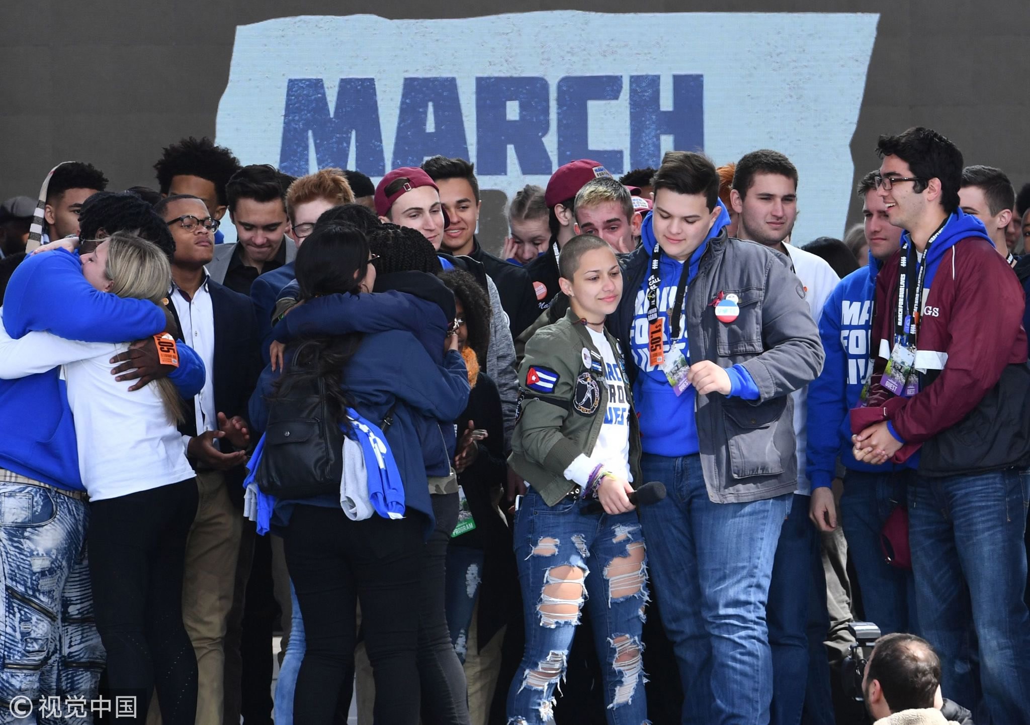 Marjory Stoneman Douglas High School student Emma Gonzalez (C) gathers with other students on stage during the "March for Our Lives" Rally in Washington, DC on March 24, 2018. /VCG Photo