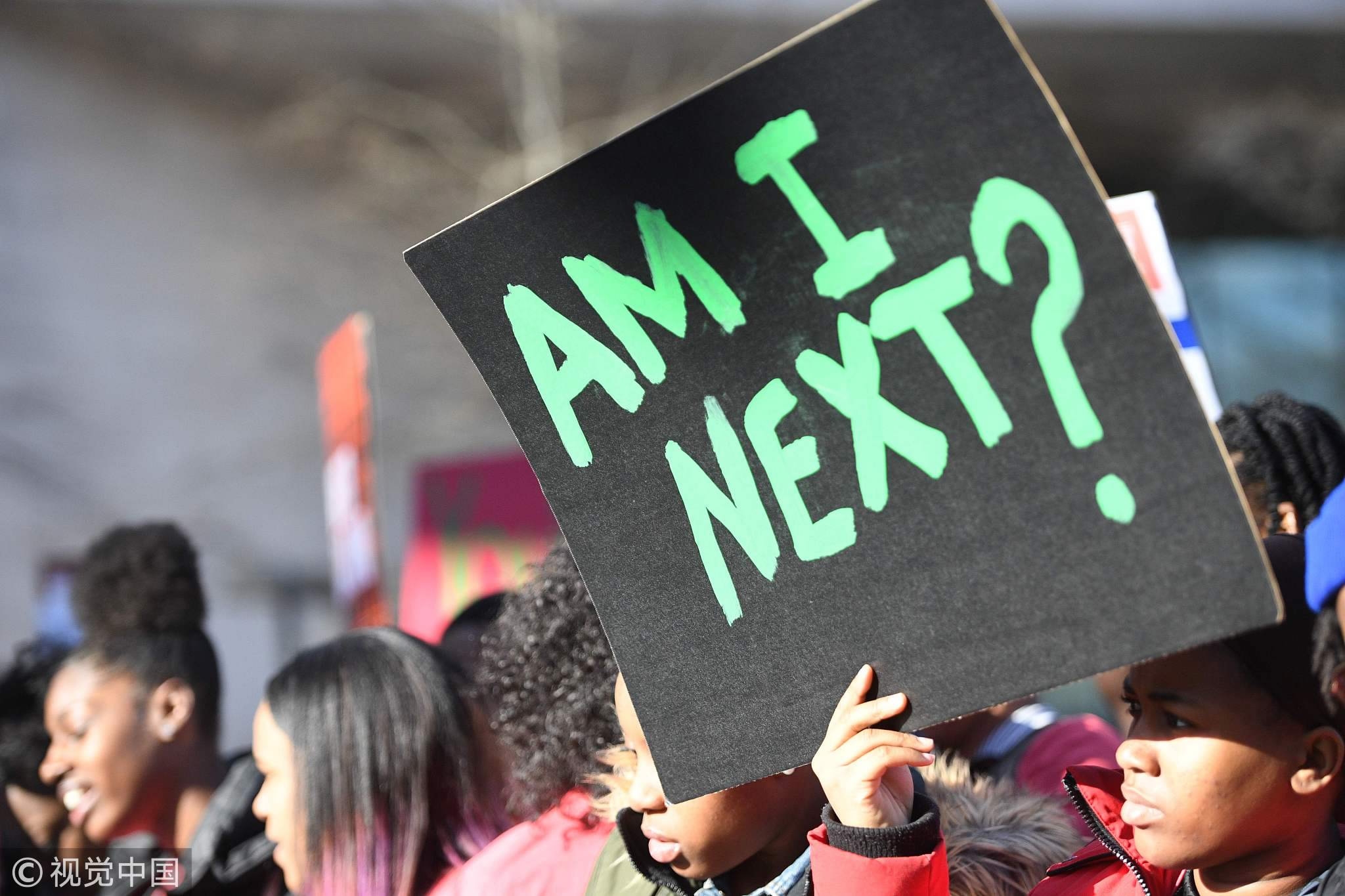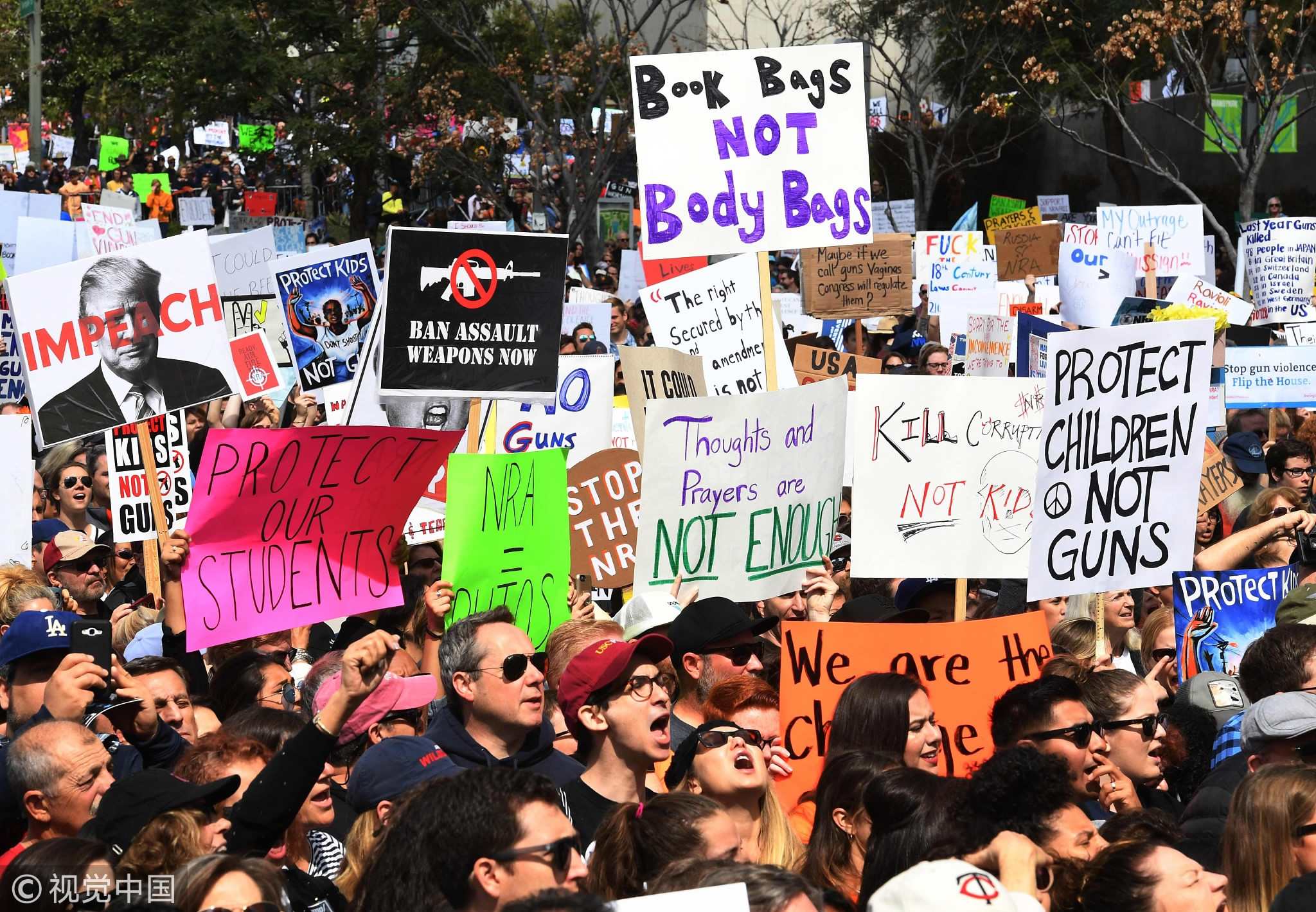 People protest for tighter gun laws during a "March For Our Lives" rally in Los Angeles, California on March 24, 2018. /VCG Photo