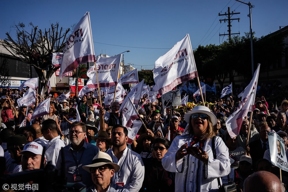 Attendees wave party flags during a campaign rally with Andres Manuel Lopez Obrador, presidential candidate of the National Regeneration Movement Party (MORENA), in Tijuana, Mexico, April 15, 2018. /VCG Photo