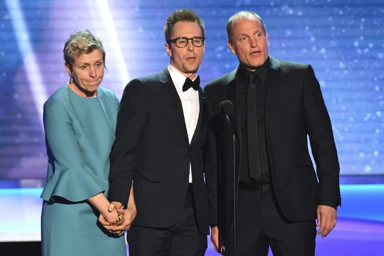 Sam Rockwell (C), Frances McDormand (L) and Woody Harrelson speak on stage during the 24th Annual Screen Actors Guild Awards show at The Shrine Auditorium on January 21, 2018 in Los Angeles, California. /AFP Photo