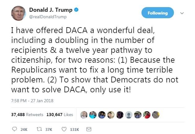 “I have offered DACA a wonderful deal, including a doubling in the number of recipients and a twelve year pathway to citizenship, for two reasons: first, because the Republicans want to fix a long time terrible problem; second, to show that Democrats do not want to solve DACA, only use it!” he tweeted.