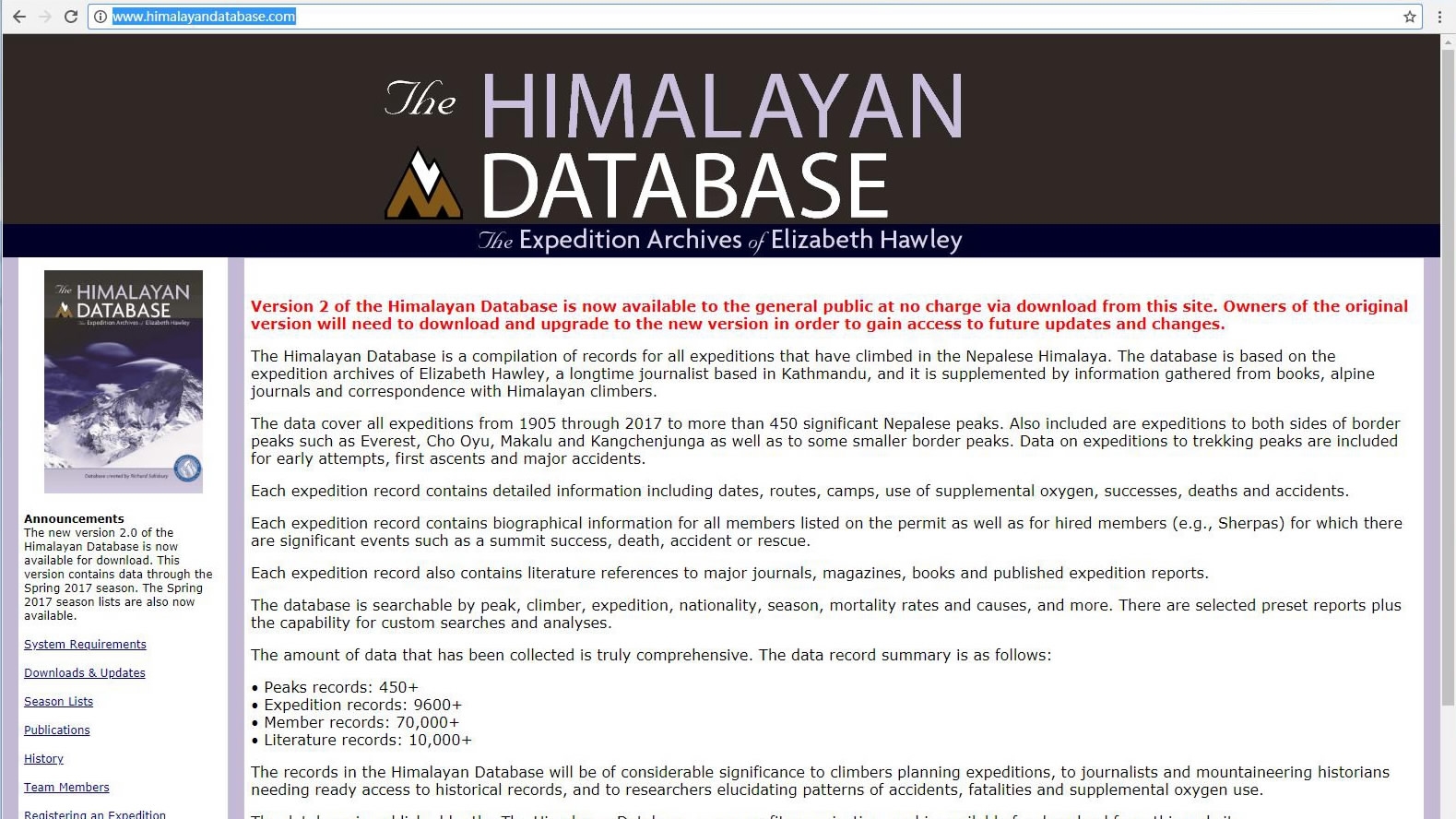 A screenshot of the homepage of the Himalayan Database, which was founded by Elizabeth Hawley and managed by her until five years ago. The database maintains a meticulous archive of all summits in Nepal's mountains.