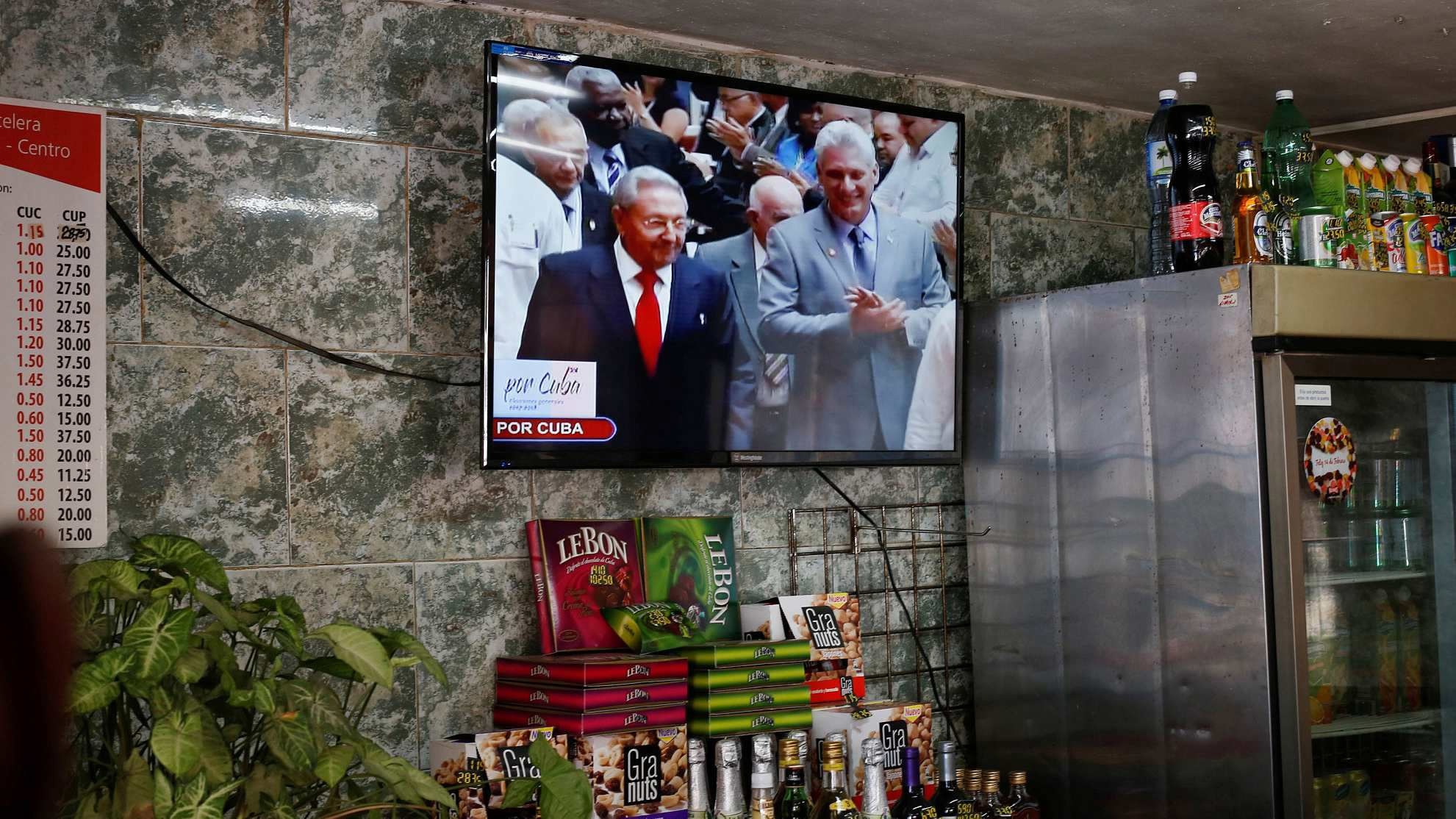 Cuba's President Raul Castro (L) and First Vice-President Miguel Diaz-Canel are seen on a TV screen at a restaurant as they arrive for a session of the National Assembly in Havana, Cuba, April 18, 2018. /VCG Photo