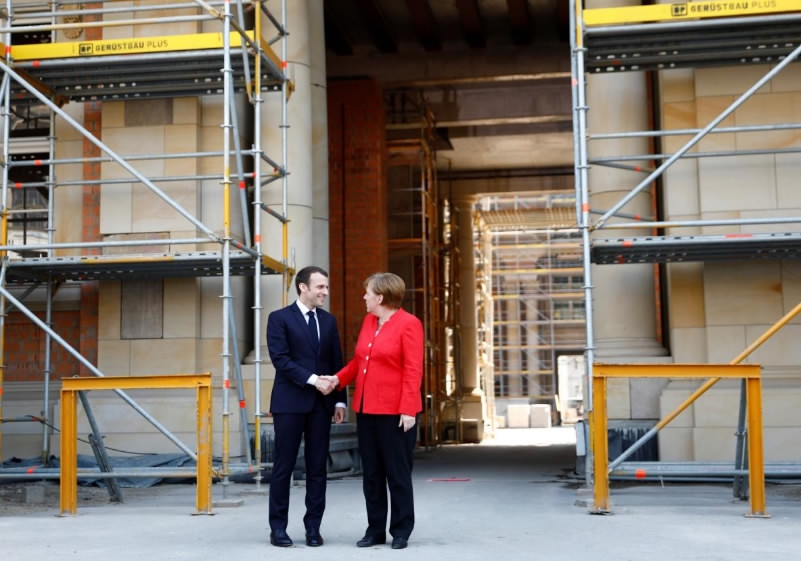 German Chancellor Angela Merkel welcomes French President Emmanuel Macron at the building site of the Humboldt Forum in Berlin, Germany on April 19, 2018. /Reuters Photo