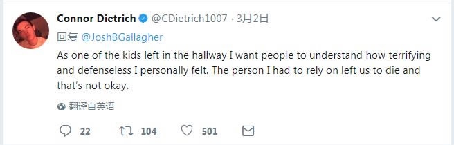 Meanwhile, Connor Dietrich wrote, “As one of the kids left in the hallway, I want people to understand how terrifying and defenseless I personally felt. The person I had to rely on left us to die, and that’s not okay.”