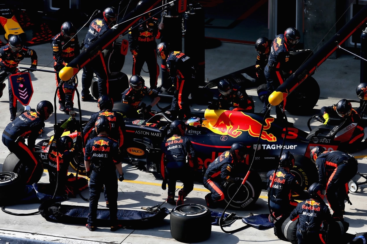 Ricciardo of Australia driving the (3) Aston Martin Red Bull Racing RB14 TAG Heuer makes a pit stop for new tires during the Formula One Grand Prix of China at Shanghai International Circuit. /VCG Photo