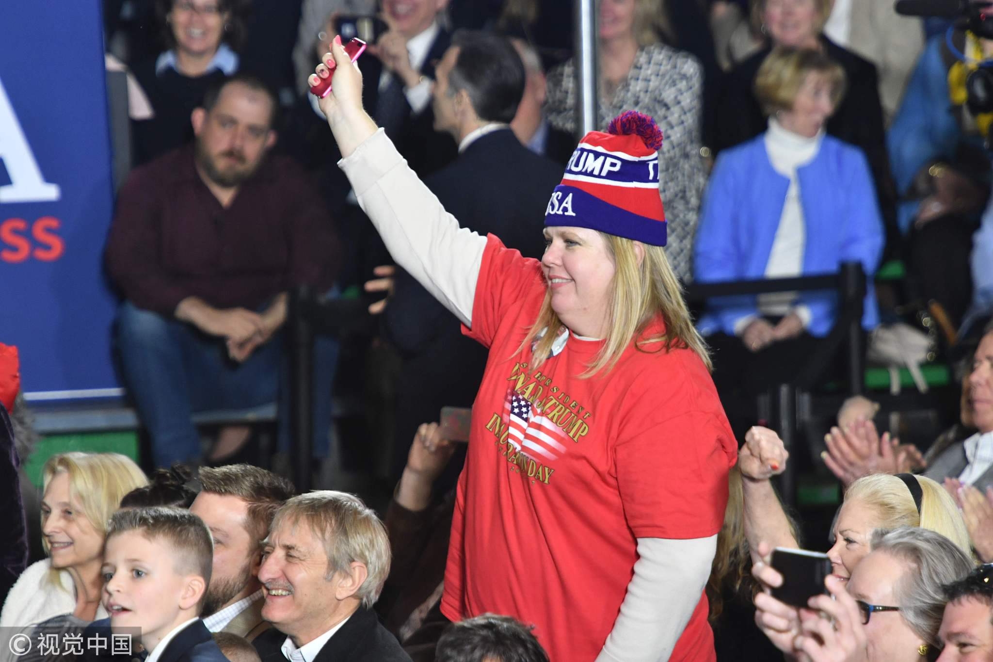 Audience members listen as US President Donald Trump speaks during a roundtable discussion on tax reform, at White Sulphur Springs Civic Center in White Sulphur Springs, West Virginia, April 5, 2018. /VCG Photo.
