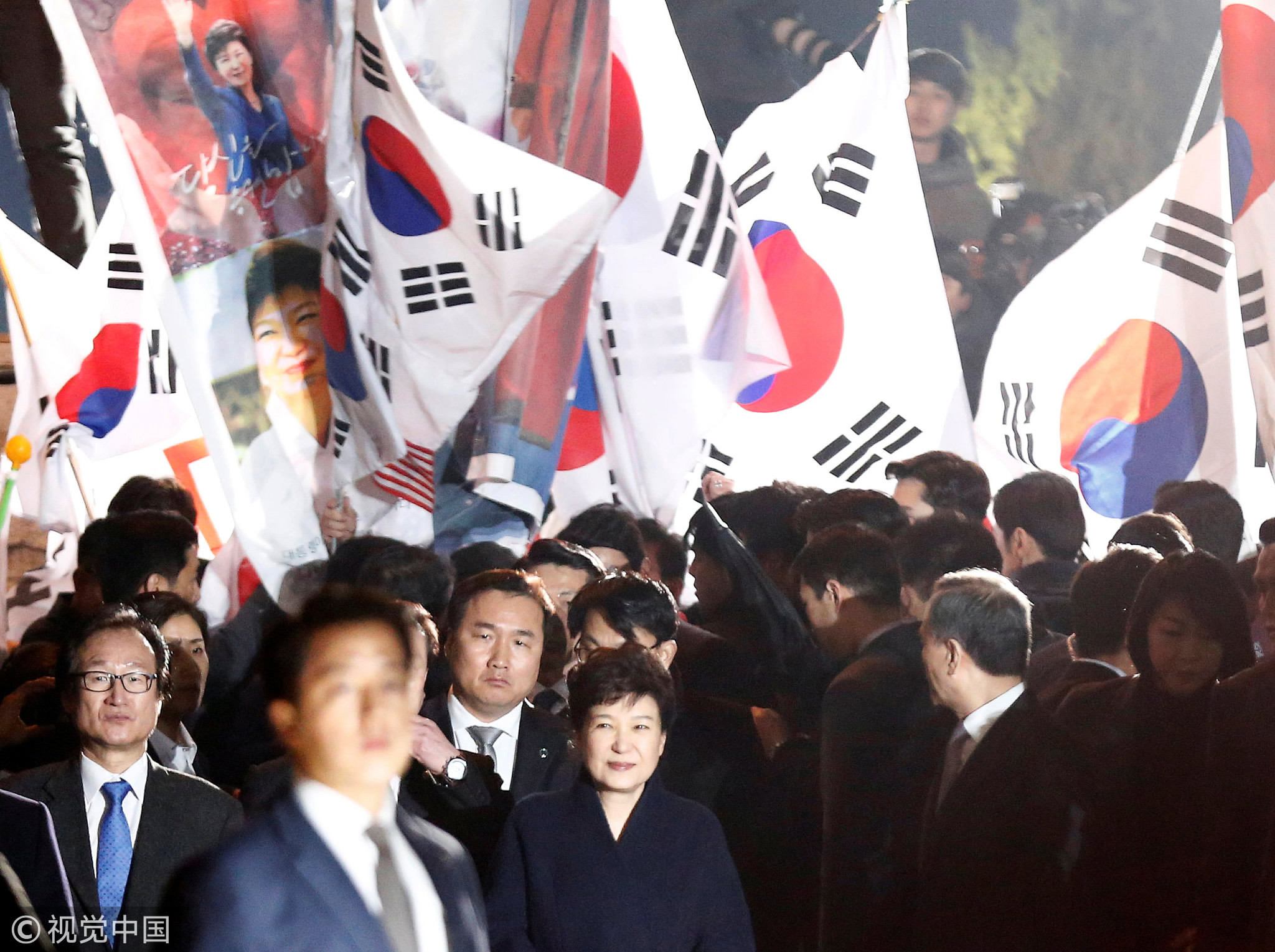 March 12, 2017: South Korea's ousted leader Park Geun-hye greets supporters on her way back home in Seoul. /VCG Photo